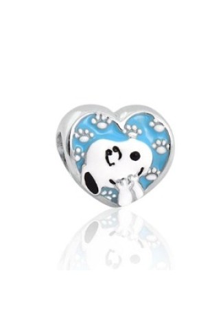 Berloque feito em Prata de Lei em formato de Coração com desenho do Snoopy e fundo esmaltado na Cor Azul com detalhes de patinhas.