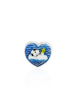 Berloque feito em Prata de Lei em Formato de Coração esmaltado na Cor Azul com desenho do Snoopy e seu amigo Woodstock deitados em uma boia.