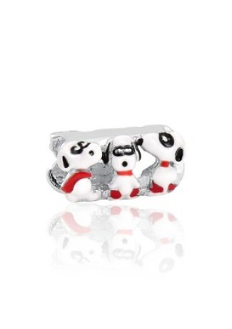 Berloque tipo separador feito em Prata de Lei em Formato de Tubinho esmaltado com detalhe de Três Snoopys vestidos como Super-Herói, com detalhe de Capa e Máscara.