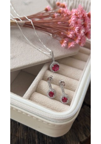 Conjunto Brincos& Gargantilha Prata 925 Zirconias Vermelho