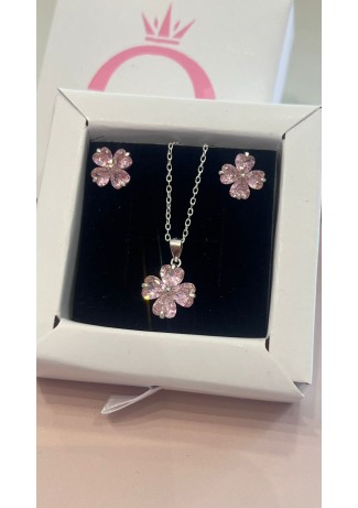 Conjunto Colar + Brincos trevos Prata 925 Rosa